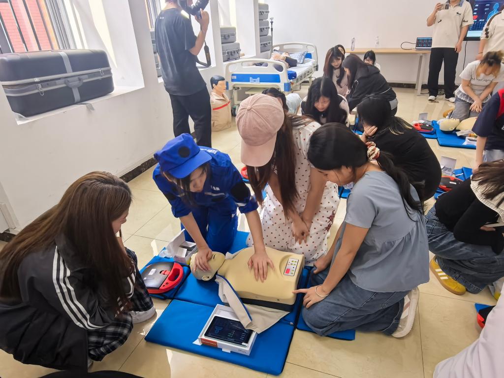 揭牌后,首期“救在身边”急救培训开课。AHA认证导师团队利用高仿真智能模拟人,重点讲解示范成人心肺复苏(CPR)、自动体外除颤器(AED)使用、海姆立克急救法及创伤止血包扎等技能。参训师生分组练习胸外按压与人工呼吸,导师逐一纠正按压深度、频率及胸廓回弹等细节,确保动作达到国际标准。