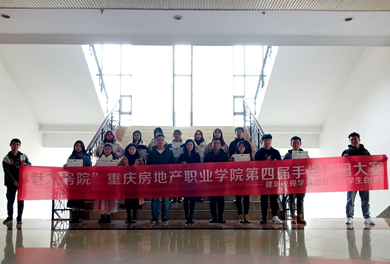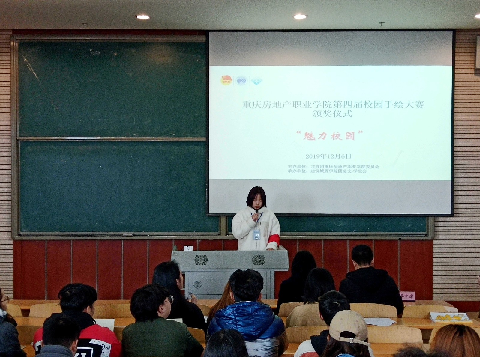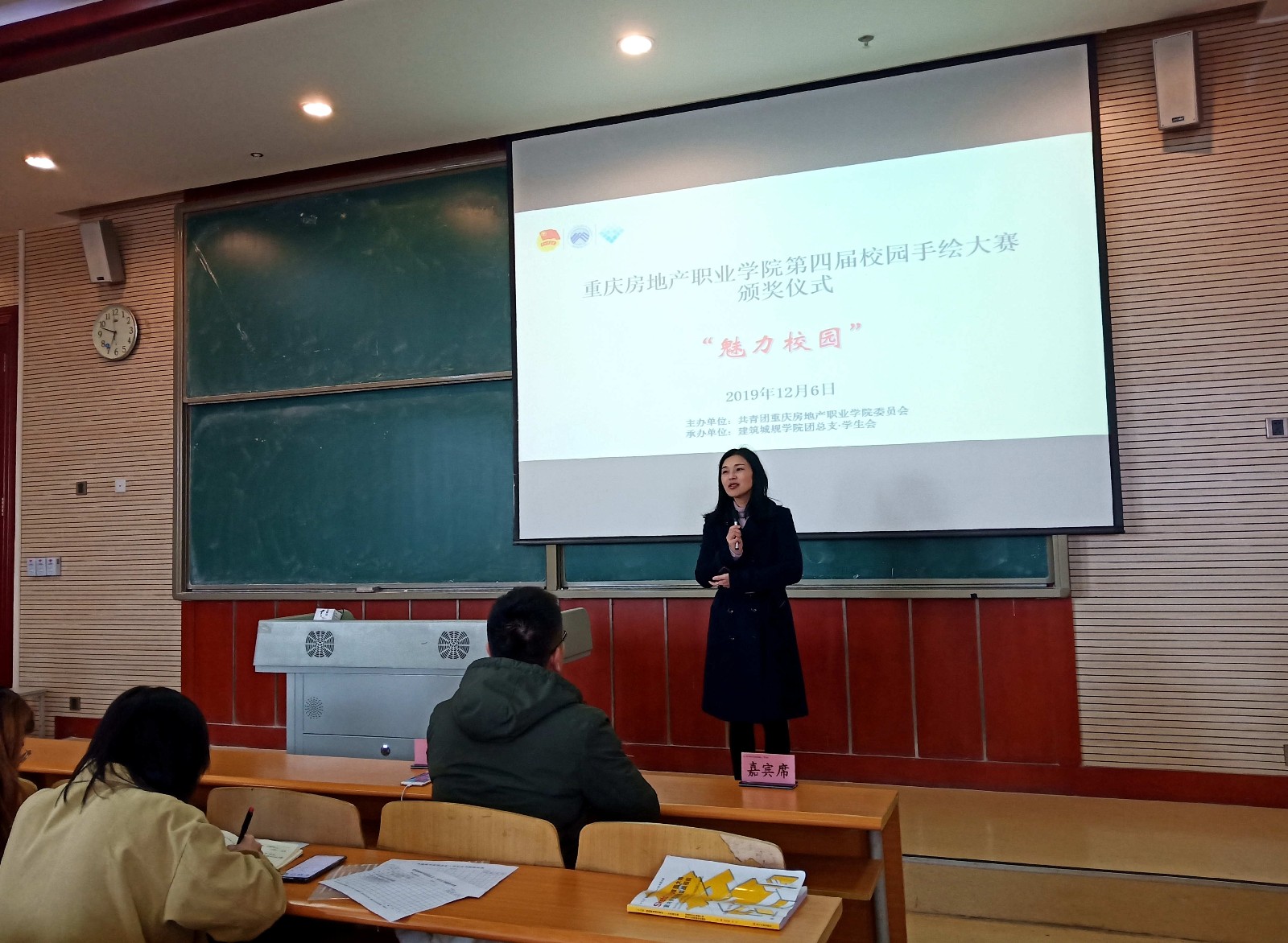 12月6日中午,由校团委主办,建筑城规学院团总支•学生会承办的“魅力房院”重庆房地产职业学院第四届手绘校园大赛在笃学楼1305举行颁奖仪式。建筑城规学院副院长彭丽莉、党支部副书记崔艳清、团总支书记王玉明及全体参赛选手和部分团总支•学生会成员出席本次颁奖仪式。
