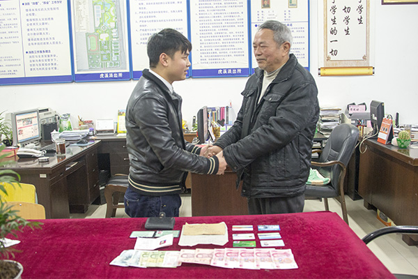 “我叫杨作成,请你们帮我找找王滔同学,我捡到了他的钱包。”1月7日,一名老人拿着一个综黑色钱包走进了学校保卫处,钱包内含有500多元人民币、8000多元外币、4个银行卡及身份证、学生证等重要证件。上午9点,老人几经周折终于见到王滔本人,并亲手将钱包交还于他。