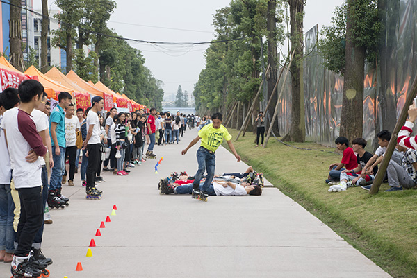 正午时分,烈日高悬当空,正值学生们下课,香樟大道上人来人往,各个社团也趁此在现场表演起各自特色。为了吸纳更多人加入社团,他们可谓是各出奇招。骑行社与众不同,他们在现场搭建一个场地,表演起花样自行车。社员们激情似火的表演,高难度花样旋转,成功吸引了大批新生鼓掌叫好。摄影社在现场展示自己的作品,滑轮社社员在现场脚踩滑轮演绎花式玩法……火爆的场面点燃整个校园,为校园添加了别样的色彩。街舞社、音乐社、美食社、摄影社、心理协会、英语协会、制图协会等多个社团也纷纷展示特色,积极参与到本次纳新活动中。
