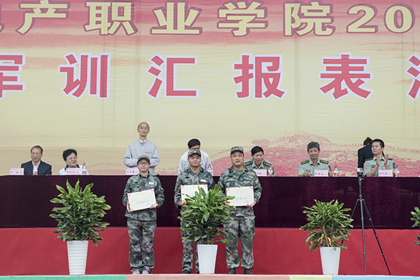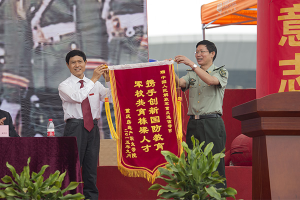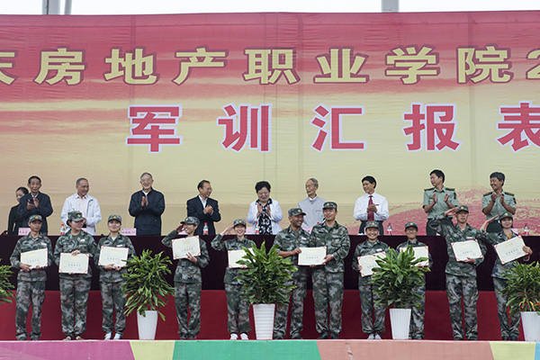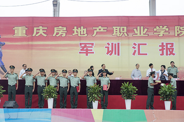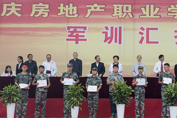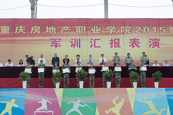 为表彰军训中表现突出的连队和个人,院长朱新才教授宣读了《重庆房地产职业学院2015级军训工作先进集体和优秀个人的表彰决定》,并向优秀连队、优秀教官、优秀教导员、优秀指导员、优秀学员颁发了优秀证书。随后,高飞跃大校讲话;院长朱新才教授向承训部队赠送了锦旗,对他们在新生军训中的辛苦付出和大力支持表示感谢。