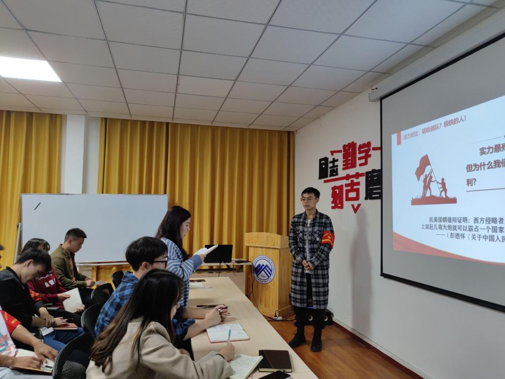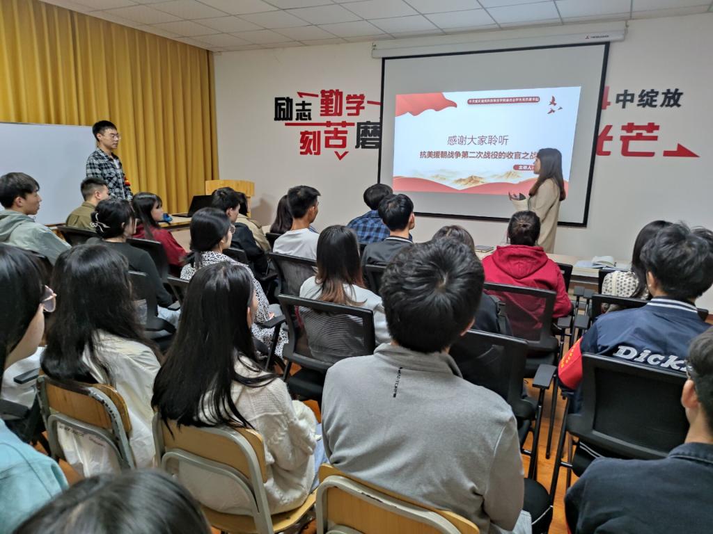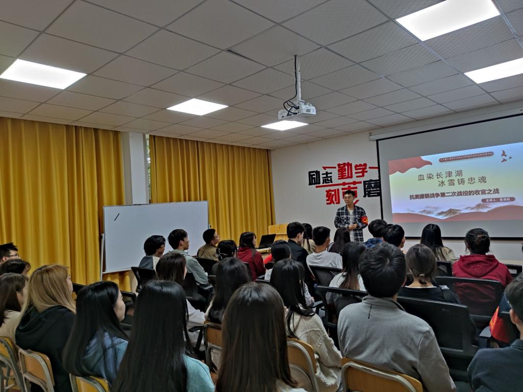 为勉励同学们在新时代继承和弘扬抗美援朝精神,实现中华民族伟大复兴,Kaiyun官方网站登录入口学生党员服务站于10月13日15:00在青年活动中心开展了以“血染长津湖,冰雪铸忠魂”为主题的思政分享会。本次分享会由建筑管理学院管浩屹同学主讲,学生处老师刘诗雨以及党员服务站的同学们共同参与。