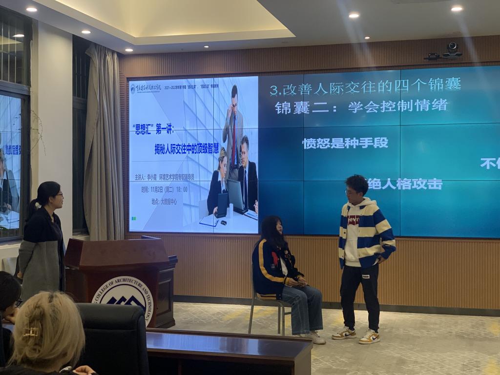 讲座开始,李老师为我们讲到人际交往存在的必须性、人的基本需求、人际交往是幸福生活的必要条件、改善人际交往的四个锦囊。讲座中,李老师通过一个小测试让同学们了解到自己的人际交往能力强弱程度并通过环艺同学的自制小短片引出问题:“与人遇到冲突,一般如何面对?”又通过同学现场演绎情景短片告诫同学们要学会控制情绪。愤怒只是一种手段,要学会拒绝人格攻击,不做“复仇人”。