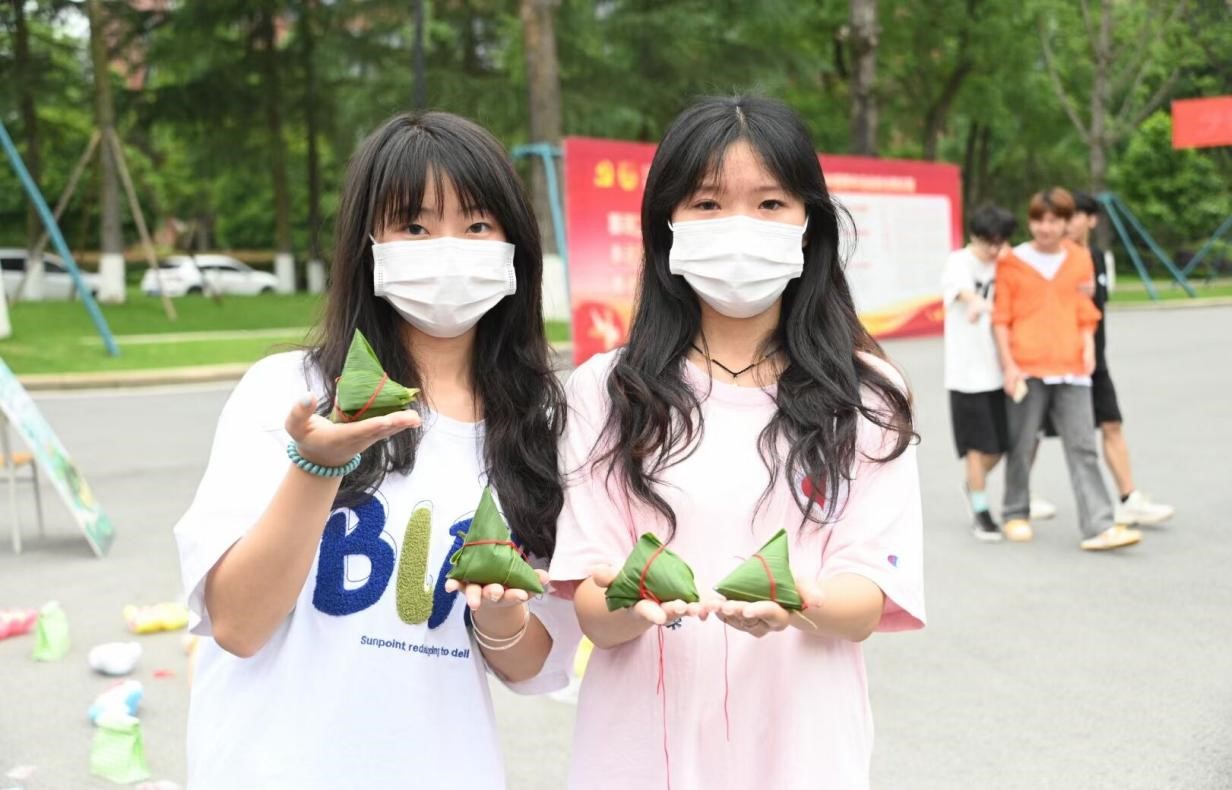 活动中,身着传统服饰的同学献上歌舞《小城谣》,活动气氛瞬间点燃。活动展示有五个部分,分别是为祈福五彩绳、香薰荷包、师生同包粽子、拼装龙舟模型以及端午套圈。活动现场热火朝天,同学们在各自喜爱的摊位前参加活动。老师们带着同学们一起包粽子,手中粽叶舞动,麻绳穿梭,一个个可爱、鲜绿的粽子就这么诞生了。