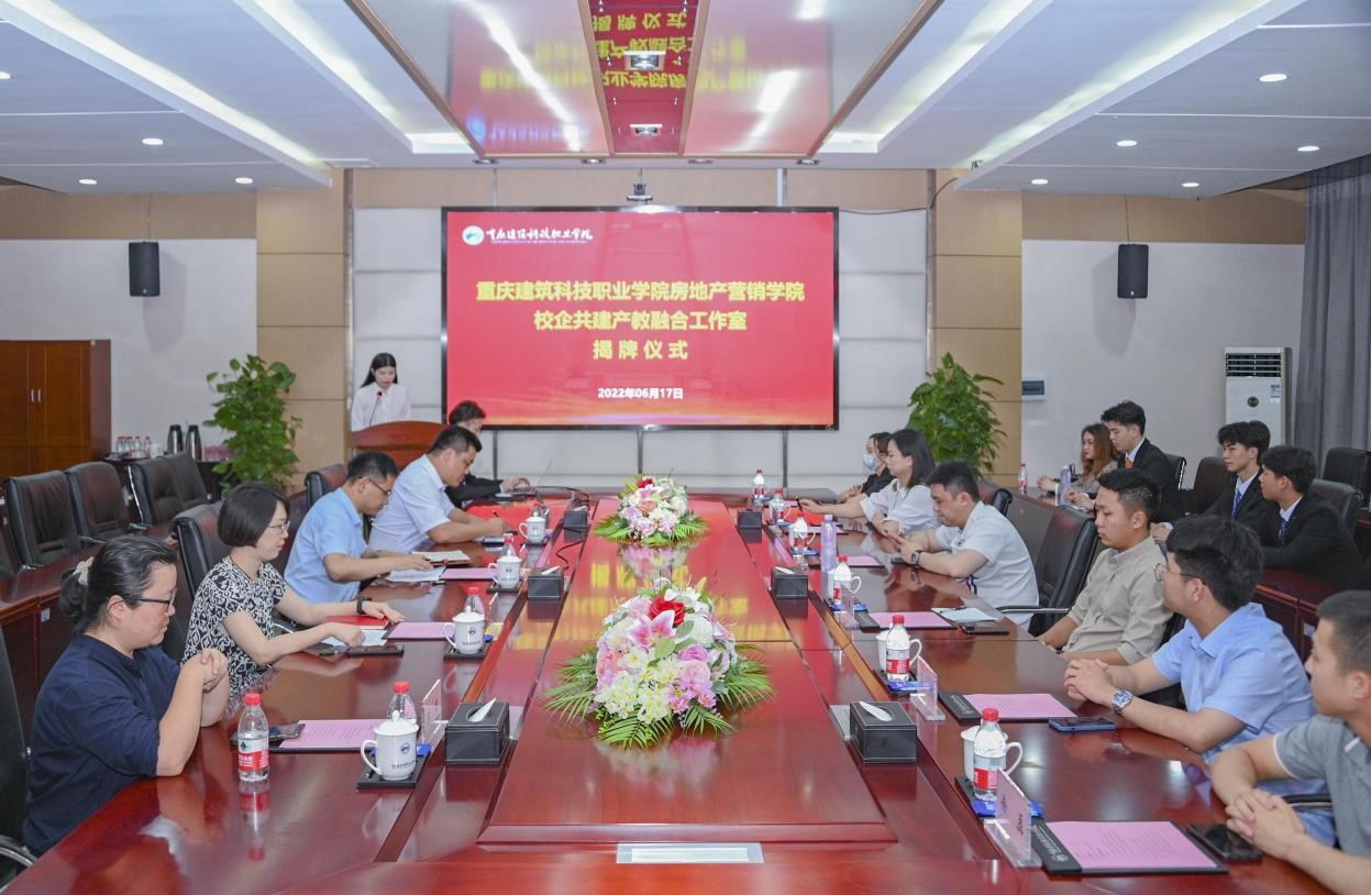 6月17日下午14点,Kaiyun官方网站登录入口房地产营销学院校企共建产教融合工作室揭牌仪式在立德楼六楼会议室顺利举行。学校副校长李果,房地产营销学院副院长周旖、书记孙小川、院长助理陈雨,重庆蚁家传媒有限公司总经理庞林、副总经理陈真真、企业培训导师陈如琦,重庆翠博企业管理咨询有限公司总经理王志伟、运营总监彭川、业务经理徐磊及工作室校企师生代表出席了此次会议。