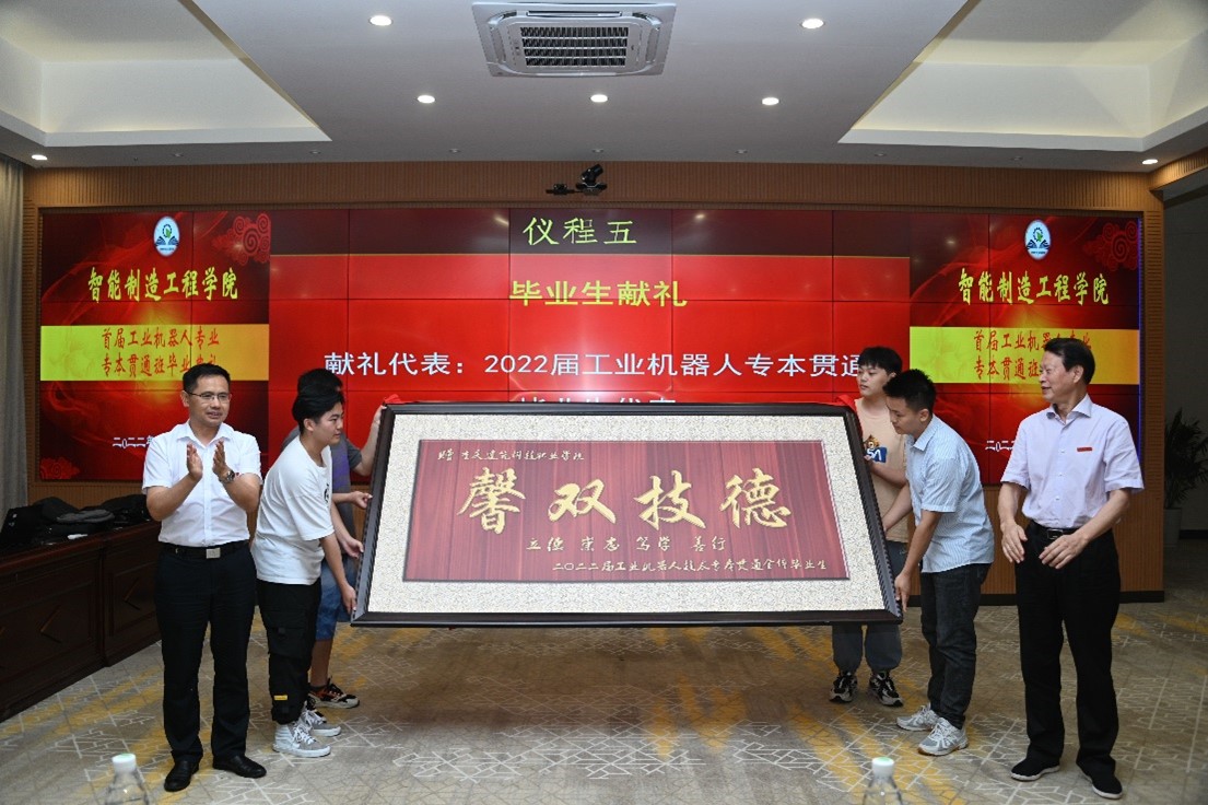 2019工业机器人专本贯通1班毕业生肖慧洋,代表全体毕业生上台向母校献礼。他向母校献上了精心制作牌匾——《德技双馨》,表达了对母校、对老师们的感激之情。