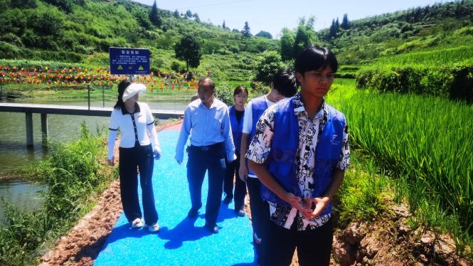 石角镇新农驻村第一书记邱俊铭向志愿者们介绍,这座桥是“湖新桥”位于新农村李家山水库旁,该桥由重庆建杰建筑工程有限公司捐建,全长36米、宽1.5米,从规划到建成完工历时约2个月,桥体整体为钢结构,联通南北院落聚居点方便老百姓出行的同时,也成为了新农村环湖步道靓丽的风景线,整个桥的建设对新农村发展乡村旅游经济,推动乡村振兴的发展起到至关重要的作用。
