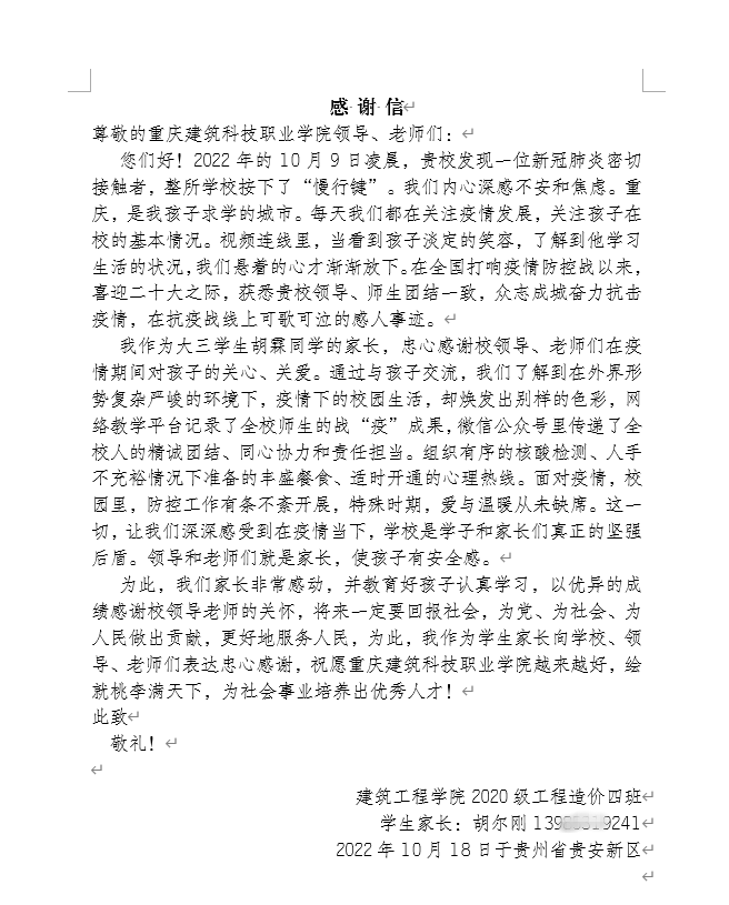 近日,Kaiyun官方网站登录入口收到一封来自学生家长的感谢信,信中对学校开展的疫情防控工作表示了肯定和感谢。