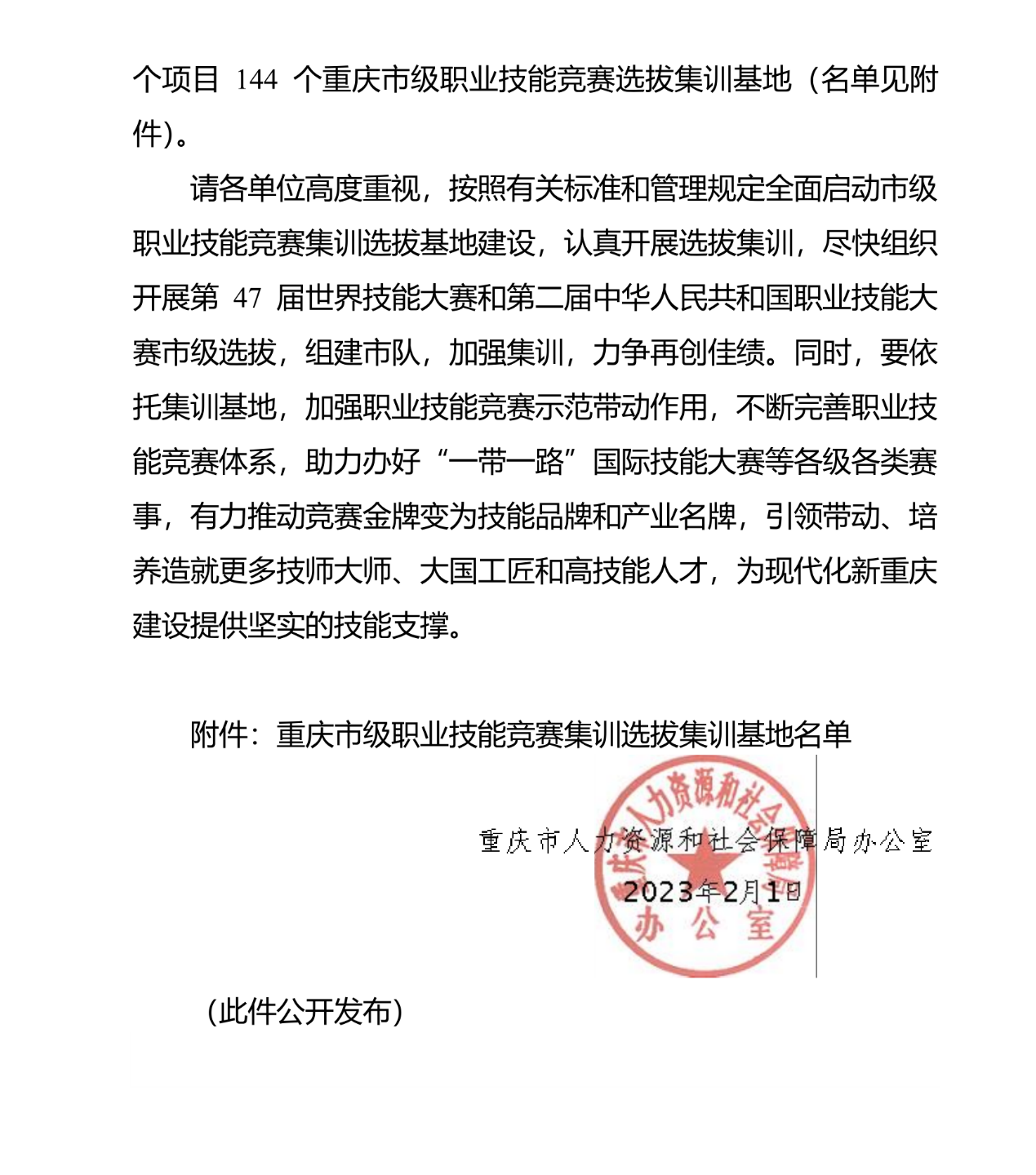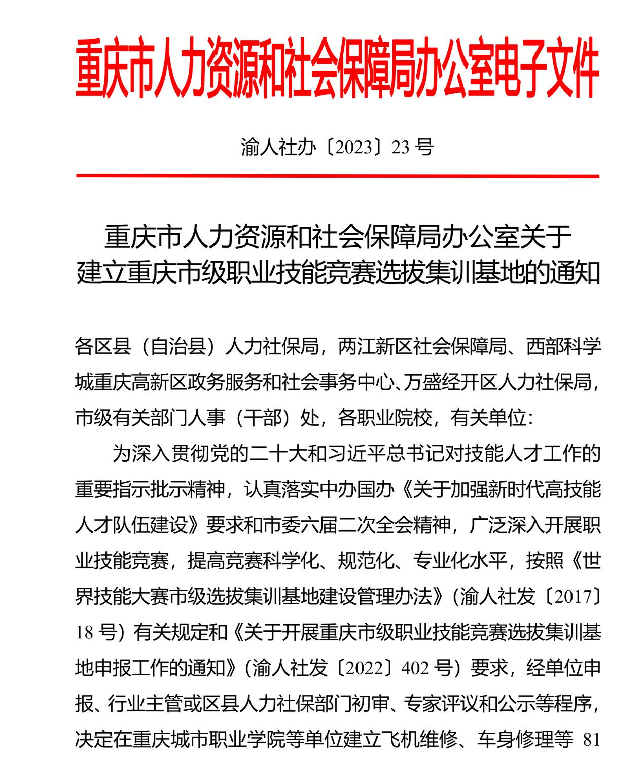 重庆市级职业技能竞赛选拔集训基地是选拔培养世界技能大赛、中华人民共和国职业技能大赛和“一带一路”国际技能大赛等竞赛选手的重要平台,由重庆市人力资源和社会保障局组织专家在全市范围内遴选,是落实“技能中国行动”和“巴渝工匠2025”行动计划的重要内容,对加快重庆市市技能人才培养、促进产业发展,具有十分重要的意义。