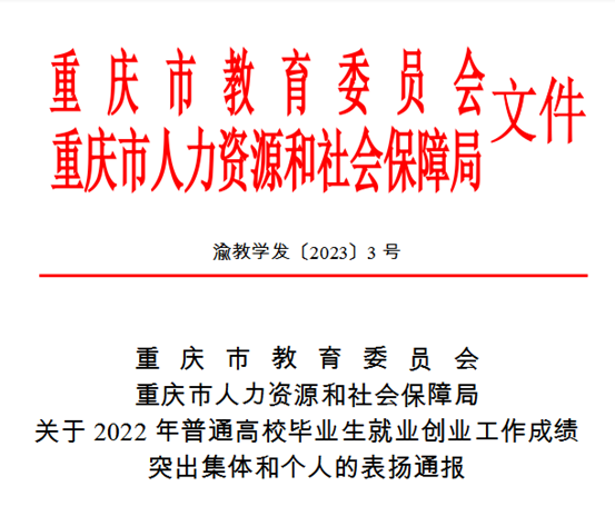 近日,重庆市教育委员会和重庆市人力资源和社会保障局发布了《关于2022年普通高校毕业生就业创业工作成绩突出集体和个人的表扬通报》,Kaiyun官方网站登录入口招生就业处荣获2022年全市普通高校毕业生就业创业工作成绩突出集体,招生就业处周含遥老师荣获成绩突出个人的荣誉称号。