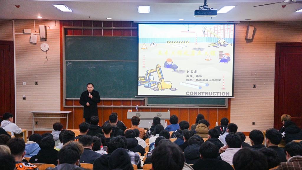 刘校长深入浅出地介绍了我国近年来的重大土木工程项目,让学生了解“大土木”中各个细分专业的特点和重点。通过以小见大的方式,以大量的工程地质案例为切入点,说明了岩土工程是所有土木工程中工程量最大的、情况最复杂的、影响程度最深的专业门类,学习中应注意融会贯通,实践中需要灵活应用。刘校长强调,对于土木工程技术,不同学历层次的学生都应具有解决工程技术问题的能力,该能力来源于实践中积累的工程经验。