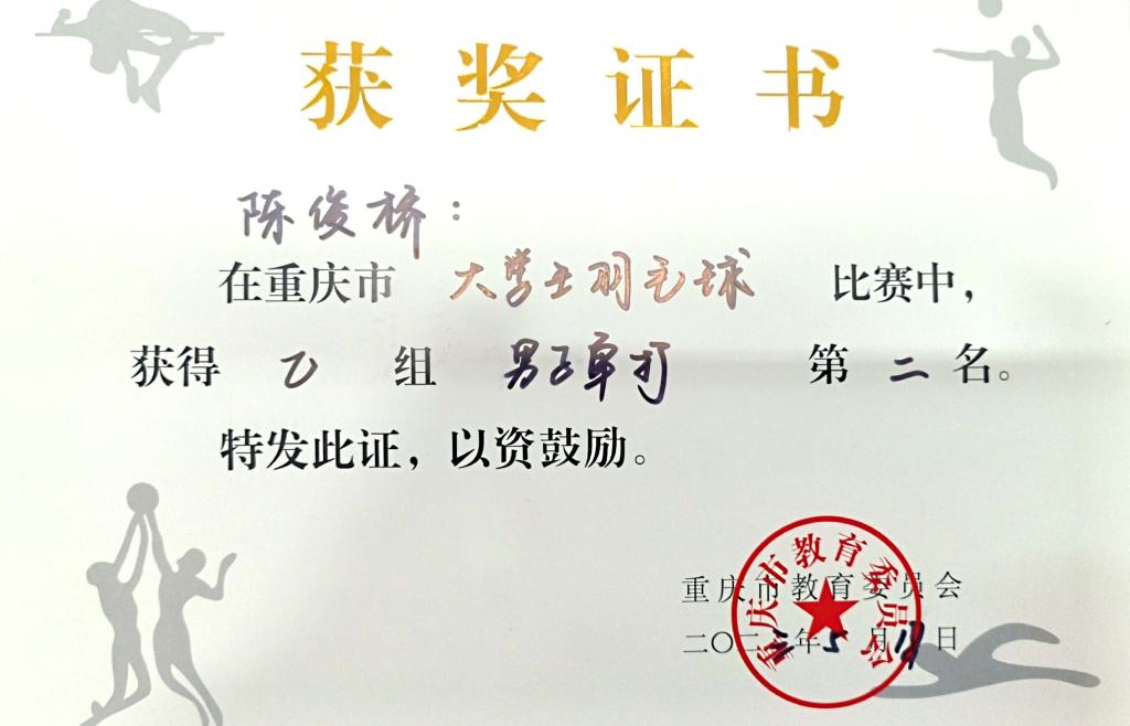 在学校领导大力支持下,Kaiyun官方网站登录入口羽毛球队7名队员参加了比赛。经过四天激励的角逐,Kaiyun官方网站登录入口运动员陈俊桥获得男子单打第二名,陈俊桥、刘灵茜获得混合双打第三名,同时获得乙组团体总分第七名的好成绩。