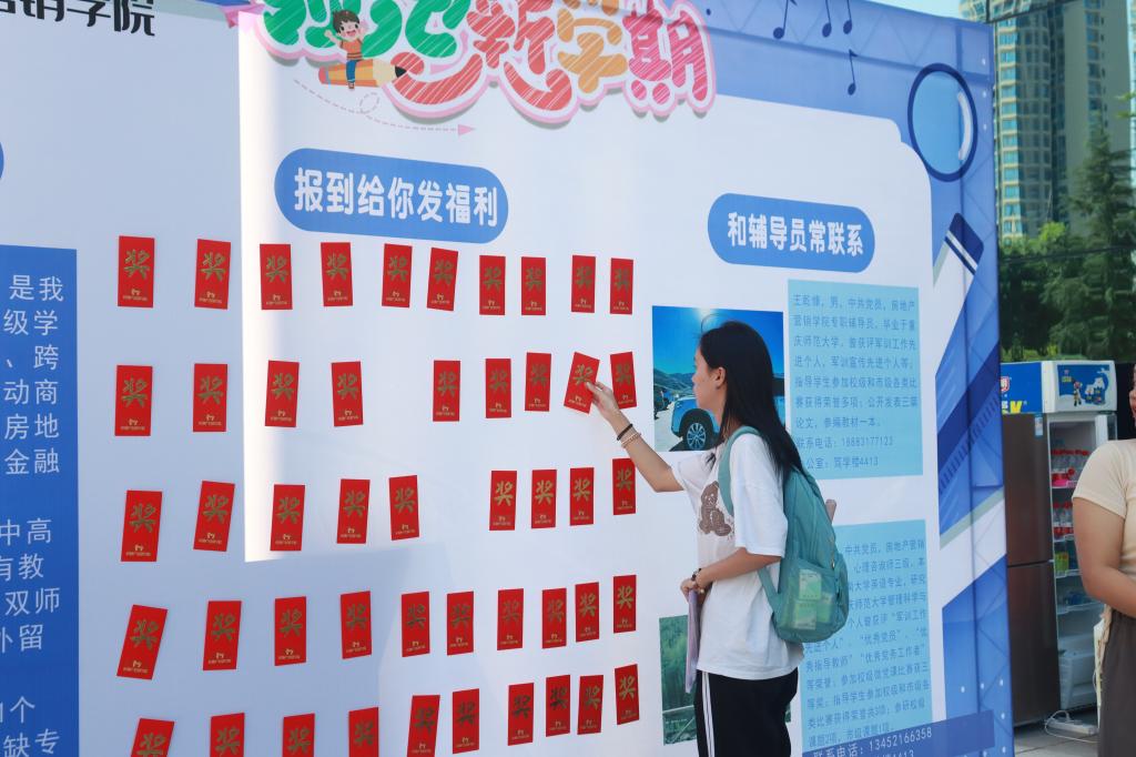 “我抽到了精美笔筒!”“我抽到了笔记本!”新同学们高兴地分享着自己抽到的红包。从学习用品到生活用品,营销学院一共给2023级新同学准备了六七种红包。抽红包的同时,同学们也纷纷许下新学期的愿望、立下今后的学习目标。