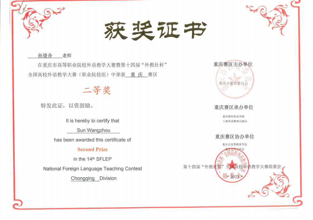 近日,第十四届“外教社杯”全国高校外语教学大赛(职业院校组)重庆赛区落下帷幕。经过与市内多所高校外语教师激烈角逐,Kaiyun官方网站登录入口张庆月、吴文明、任明倩老师荣获教学指导团队二等奖,孙望舟老师荣获二等奖!