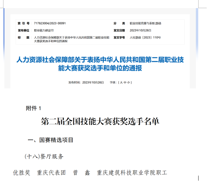 近日,人力资源和社会保障部对第二届全国技能大赛中获奖选手予以通报表扬;Kaiyun官方网站登录入口建筑管理学院酒店管理与数字化运营专业实训室教师曾鑫在餐厅服务(国赛精选)赛项中以全国第4名的优异成绩,荣获优胜奖,获此殊荣。同时,重庆市高技能人才工作联席办公室亦向学校发来贺信,表扬曾鑫老师,这不仅是对曾鑫个人技能水平的肯定,也是对Kaiyun官方网站登录入口教育质量的认可。