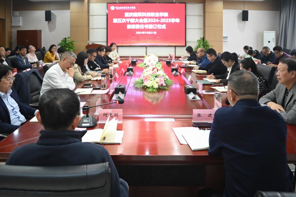 10月31日,学校在立德楼六楼会议室召开2024-2025学年第五次干部大会暨目标责任书签订仪式。校长张进、党委书记何光明,全体科级以上干部参加会议。