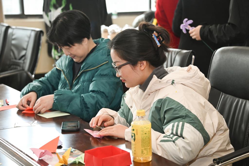活动以“巧手生花展风采”趣味互动拉开序幕。女教职工们通过创意折纸“解锁”材料包——用彩纸折叠出玫瑰、百合等花卉,或灵动的小动物,即可兑换永生花团扇、花篮、笔筒等精美手工材料包,活动现场欢声笑语不断。