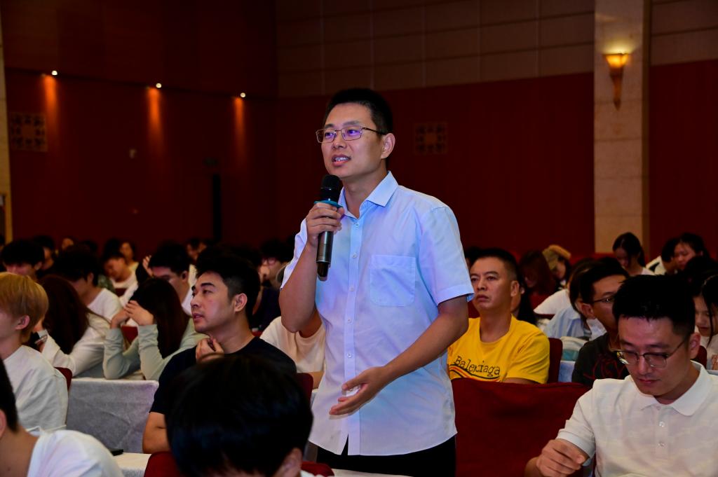 在互动问答环节,师生围绕“生物材料在智能建造中的应用场景拓展”“跨学科交叉创新机制构建”“技术突破的关键瓶颈”等热点问题踊跃提问。刘院士结合自身科研经验逐一解答,既解答了“如何通过基因编辑优化生物材料性能”的技术细节,也分享了“高校-企业-科研机构协同攻关”的实践路径,鼓励师生以“问题导向+跨界思维”投身前沿领域。现场氛围热烈,思想的火花频现,进一步激发了师生对“生物科技+建筑产业”融合创新的探索热情。