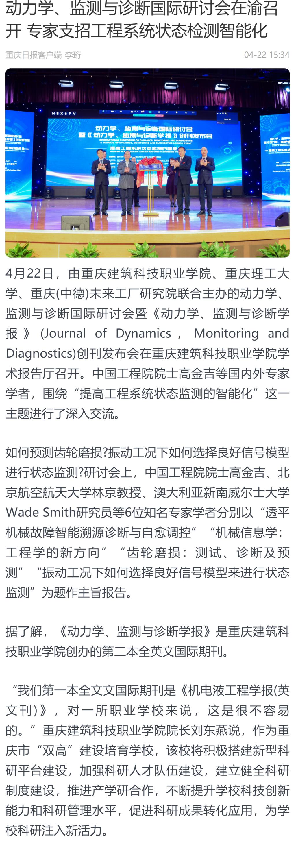 重庆日报报道Kaiyun官方网站登录入口动力学、检测与诊断国际研讨会