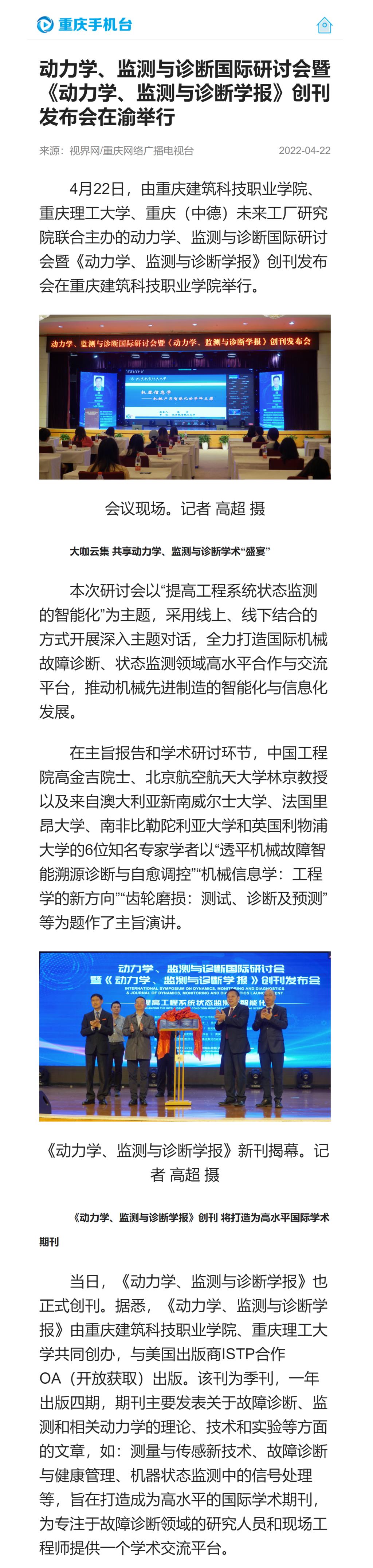 重庆手机台报道Kaiyun官方网站登录入口动力学、监测与诊断国际研讨会暨《动力学、监测与诊断学报》创刊发布会在渝举行