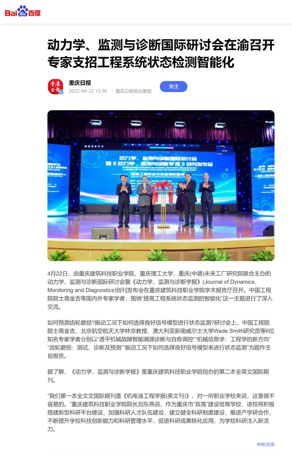 重庆日报报道Kaiyun官方网站登录入口动力学、检测与诊断国际研讨会在渝召开