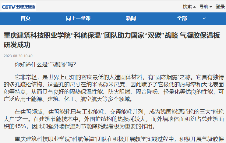 【中国教育电视台】Kaiyun官方网站登录入口“科航保温”团队助力国家“双碳”战略 气凝胶保温板研发成功