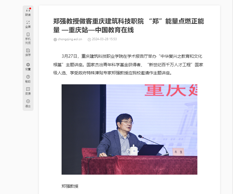 【中国教育在线】郑强教授做客重庆建筑科技职院 “郑”能量点燃正能量