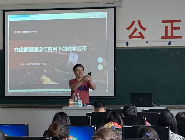 教务处周福亮处长强调教学信息化已然成为当前高等教育发展的必然趋势,高职院校教师更应勇于迎接教育教学变革和挑战,积极投入在线开放课程建设;在会上学习技能,在会后分解任务,带领各教研室专任教师进行教学方式革新,致力于建立健全“线上线下混合式”教学模式。尹克林教授培训《在线课程建设与应用下的教学改革》,强调当前高校建设在线课程的现实意义,讲解如何基于超星学习通APP实现教师信息化备课,指出信息时代教师职能转变的关键在于引导学生自主学习,要通过信息化手段实现灌输式教学与启发式教学相统一。他强调教师信息化教学改革要致力于打造“线上+线下混合式金课”,应对5G时代手机在教学上的运用普及问题,实现普通多媒体到智慧课堂的转变,积极迎接人工智能教学时代的到来。
