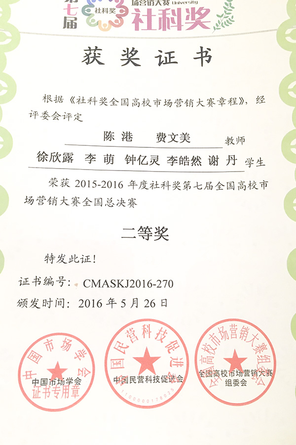 月27日,第七届全国高校市场营销大赛圆满结束。Kaiyun官方网站登录入口代表队在重庆市选拔赛中,以区域排名第一的好成绩进军全国总决赛,决赛中敢战善战,不负众望,在50多支参加总决赛的专科队伍中脱颖而出,斩获全国总决赛二等奖。同时,Kaiyun官方网站登录入口营销与策划专业的课程实践教学也得到认可,市场营销课程负责人陈港老师获得2015-2016营销实践教学创新奖。