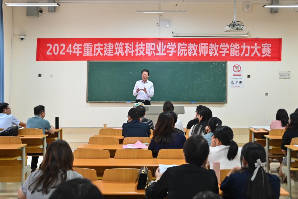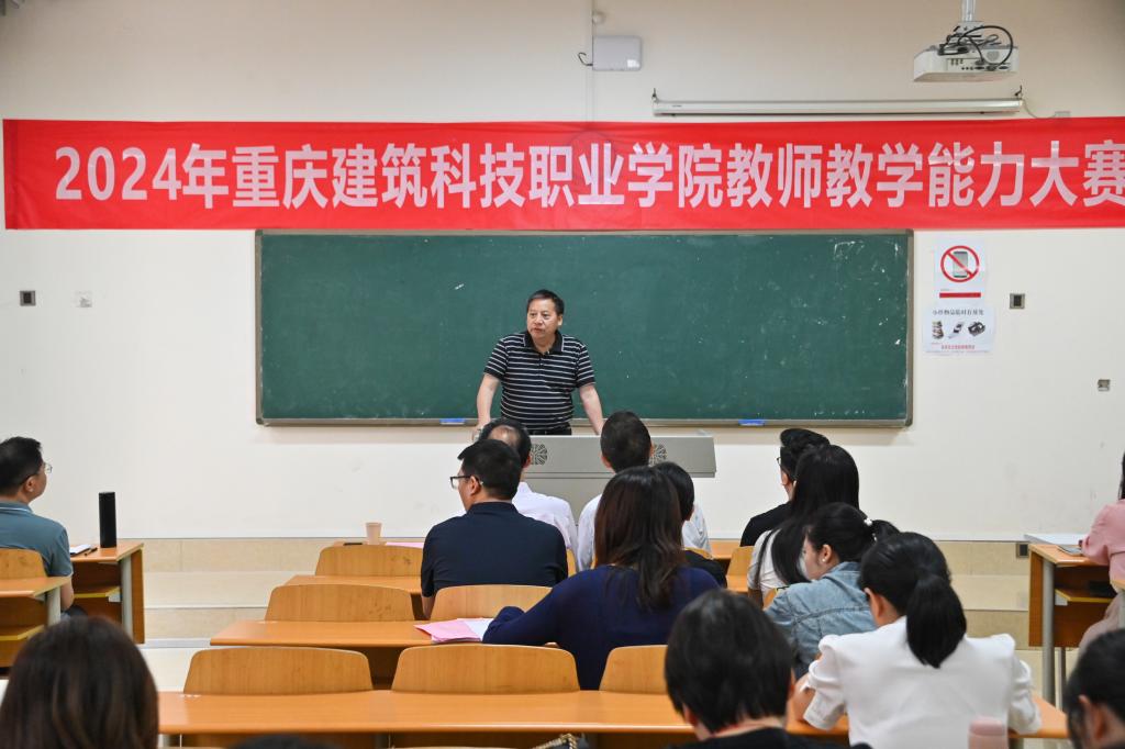 何培斌副校长就本次大赛的背景与规则进行介绍,本次大赛由教务处组织实施,二级学院遴选推荐,共计13支教师代表队伍、50名参赛教师分组竞技。大赛自今年3月份启动以来,各二级学院教师团队围绕教学内容、教学设计、教学实施、教学评价和教学反思的比赛内容,通过培训交流,精心打磨教学材料,实现了二级学院全参与、课程类型全覆盖、教师技能全提升。
