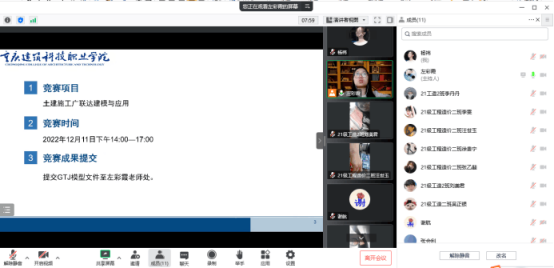 2022年12月11日14:00时,工程造价教研室组织2021级工程造价专业学生开展了劳动技能大赛,由于疫情原因,采用腾讯会议线上全程直播的形式,本次参赛的共有8名选手,由左彩霞老师主持评审,张会利老师负责监赛。