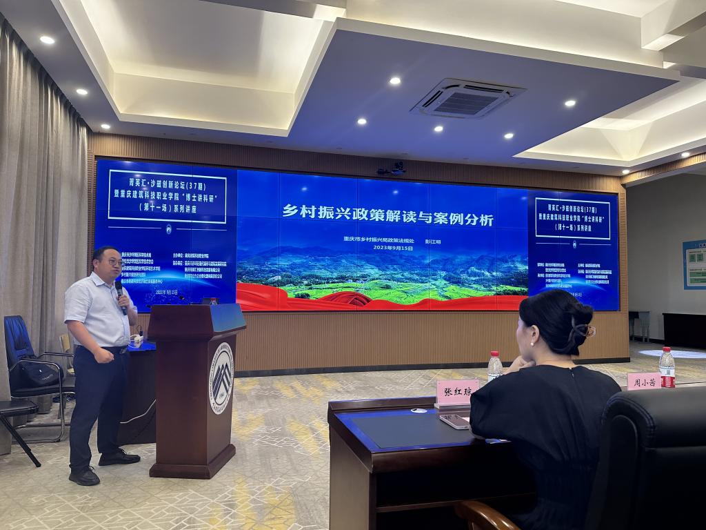 2023年9月15日下午,由Kaiyun官方网站登录入口主办,环境艺术学院承办的菁英汇·沙磁创新论坛(36期)暨Kaiyun官方网站登录入口“博士讲科研”系列讲座活动(第11场)在Kaiyun官方网站登录入口大数据中心顺利举行。本次讲座活动邀请了来自重庆市乡村振兴局政策法规处副处长彭江明作为讲座嘉宾,Kaiyun官方网站登录入口副校长周俊华,科研处处长周小茜,产业办主任、乡村振兴学院院长湛杨,环境艺术学院书记张慎富,环境艺术学院副院长张红琼,环境艺术学院院长助理曾易成,各学院骨干教师及学生代表共计80余人参会。