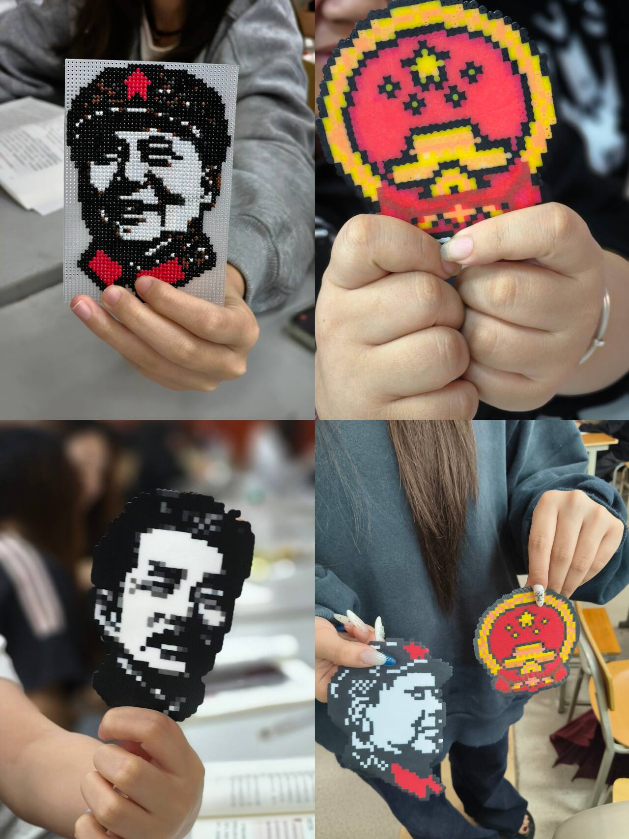 为深入推进思想政治理论课改革创新,实现思政教育与美育实践深度融合,引导青年学子厚植爱国情怀、强化责任担当。我院思政教研室成晓静老师在所在班级,依托课程《毛泽东思想和中国特色社会主义理论体系概论》课程,率先举办 “拼绘红色经典・践行青春使命”毛概课程主题拼豆创意创作大赛。本次大赛创新采用拼豆手工创作这一趣味形式,将思政理论知识与红色文化、党史精神、青年使命紧密结合。旨在让同学们在动手实践、创意构思的过程中,深化对思政理论的理解与感悟,摆脱传统理论学习的枯燥感,以年轻化、沉浸式的方式传承红色基因,践行新时代青年的使命担当,让思政课堂真正活起来、实起来。