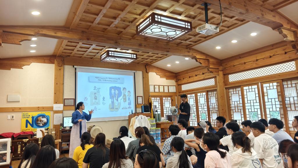 8月6日至8月9日,研学活动进入“文化体验+实践感知”阶段。6日,学生在留学生自习室学习韩国语基础与韩国文化课程,随后体验韩国传统体育项目——跆拳道,在动作练习与文化讲解中感受韩国“礼始礼终”的武道精神;8日,团队先后参与宝石香氛制作、螺钿书签制作等韩国传统工艺体验,亲手创作具有韩国文化特色的手作,直观感受韩国传统美学与工艺智慧;9日,团队前往全州韩屋村,在青乙传统文化院学习韩国传统礼仪并体验韩服穿搭,随后参与韩式拌饭制作,还体验了天然香皂制作与茶道,全方位沉浸式感受韩国传统文化的韵味。