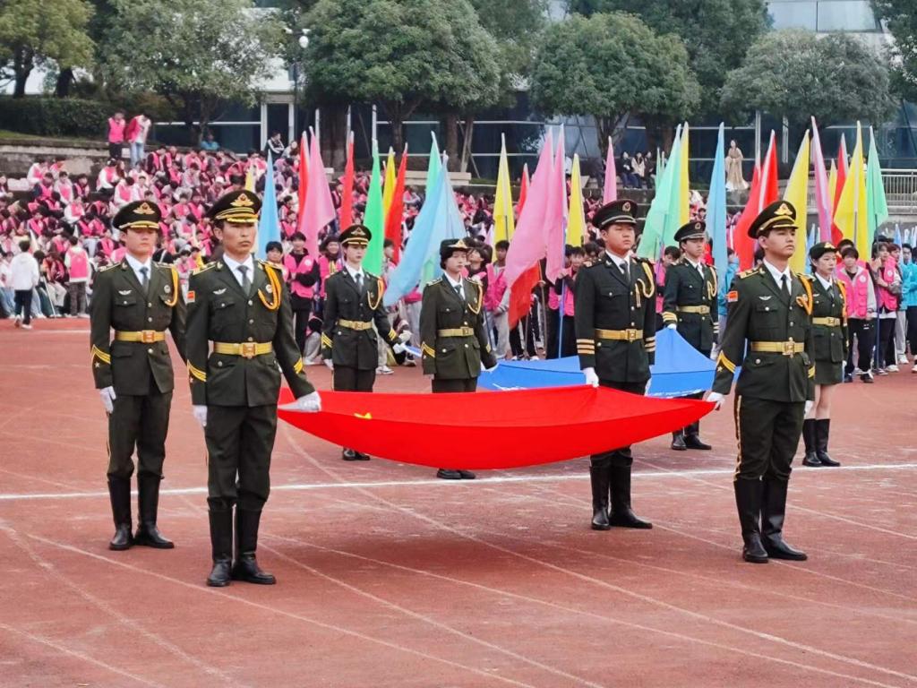 【学校国旗队、校旗和会旗方队】伴随着《运动员进行曲》的响声,学校国旗队、校旗和会旗方队迈着整齐而庄严的步伐向我们迎面走来,看,个个精神抖擞,犹如雄鹰准备叱咤风云。
