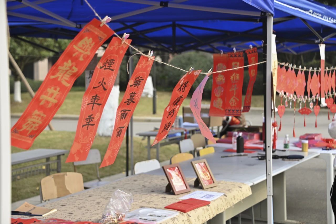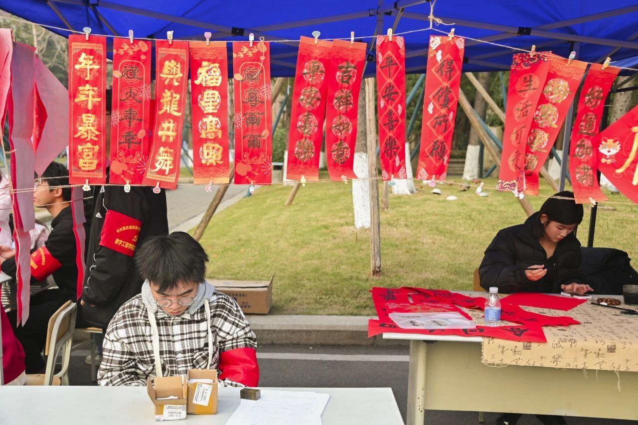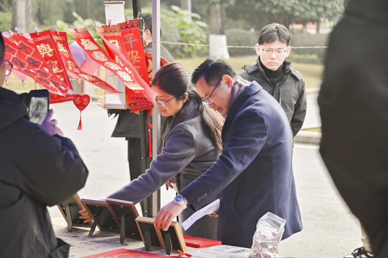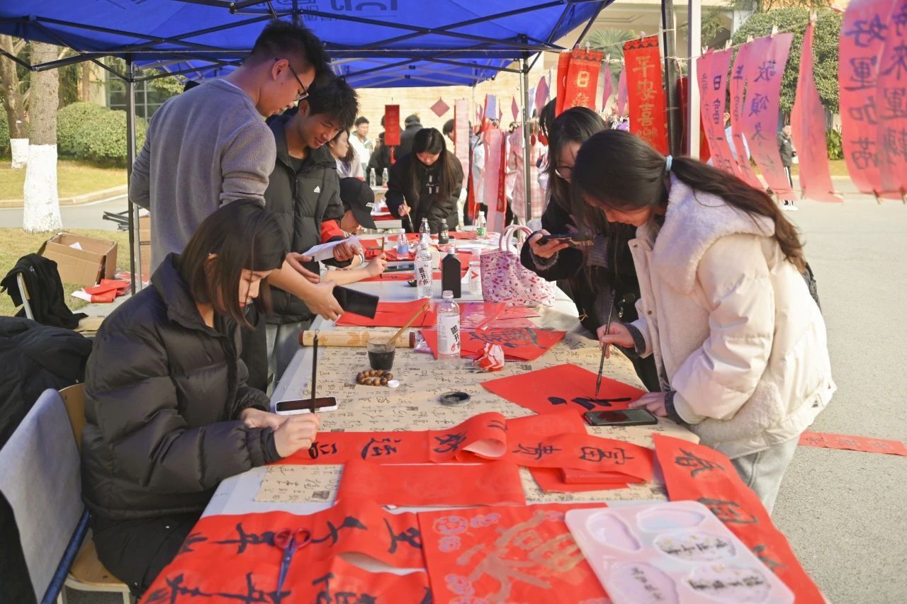 随着春节脚步临近,新春年味逐渐"浓"起来,为营造欢乐祥和的节日氛围,一旁的“迎新年”歌响起,活动现场,春联纸、毛笔和砚台被整齐地摆放在桌子上,鲜红的纸张渲染着浓浓的节日氛围。节日氛围瞬间拉满,很快成为了学校的焦点。同学们纷纷到来现场,有的一旁参观,有的亲手上笔…阵阵墨香指尖流,幽幽韵味心脾沁。一笔一墨、一横一竖、一撇一捺...一副副写满新年祝福的春联和“福”字,写的是汉字,报的是节讯,暖的是人心,不管是参与者还是旁观,他们都饱含着真情,干黑墨红纸间感受着笔墨丹青的独特魅力,浸润的是优秀文化,续写的是美好祝愿。