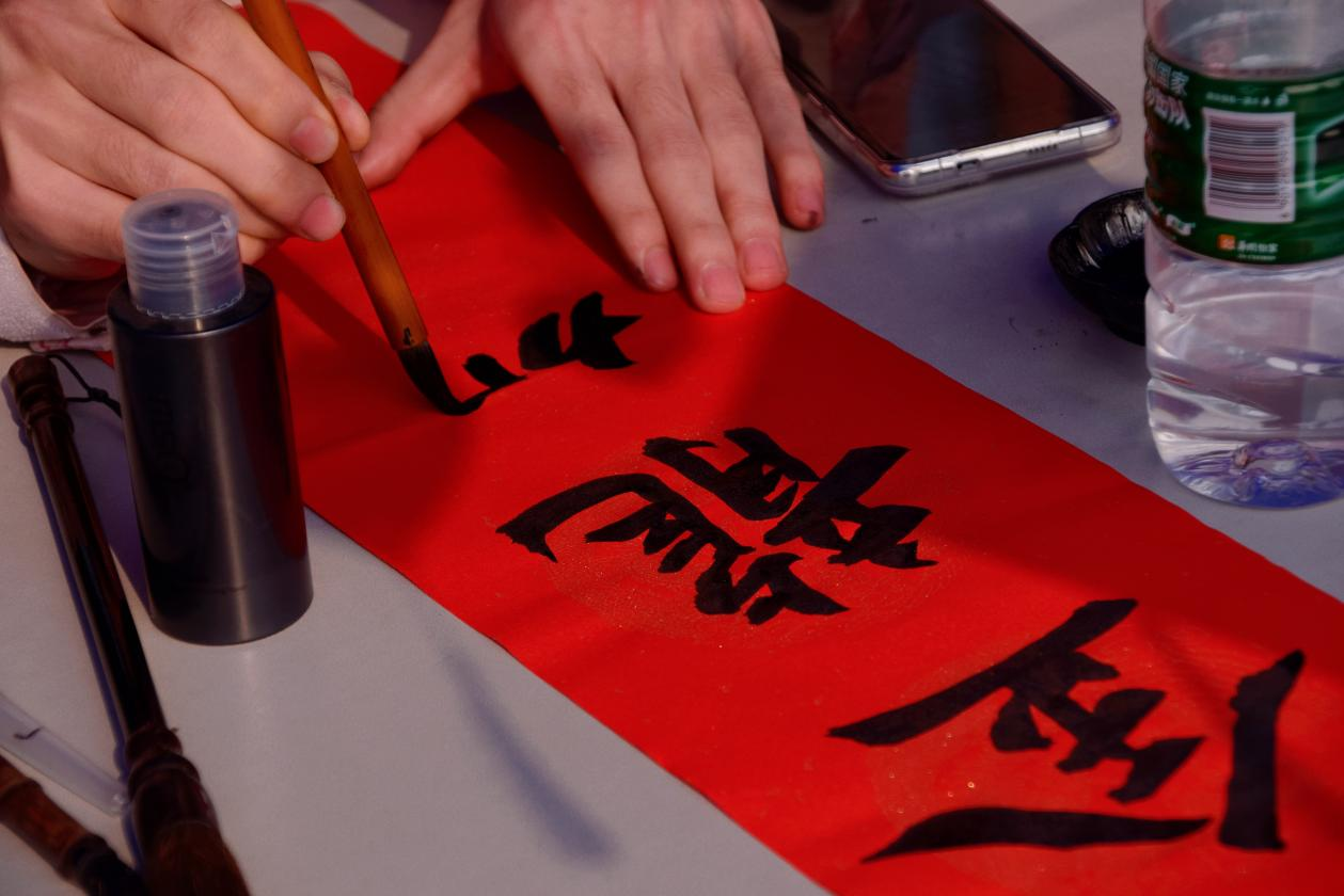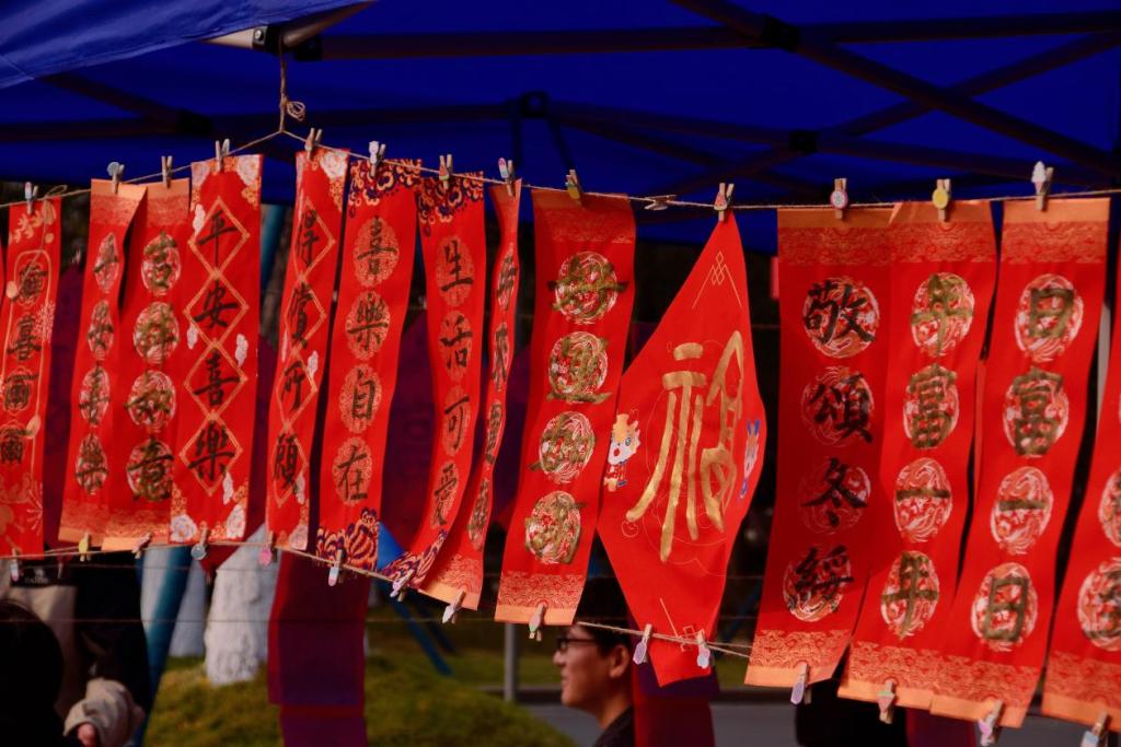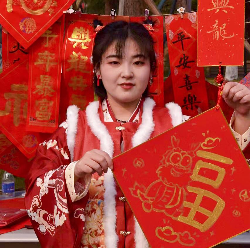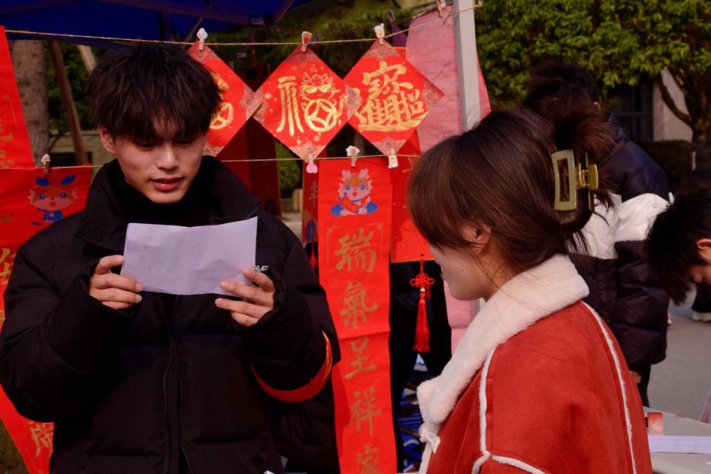 阵阵墨香指尖流,幽幽韵味心脾沁笔尖的金粉和红色的宣纸漾开成一幅春联。师生驻足屏息观赏、仔细体味,有的精心挑选着自己喜欢的福字和对联,还有的帮助工作人员铺纸研墨,助添书写春联的激情。一副副平安和谐、吉祥如意的春联,带着挥别兔年、喜迎龙年,辞旧迎新的美好祝愿