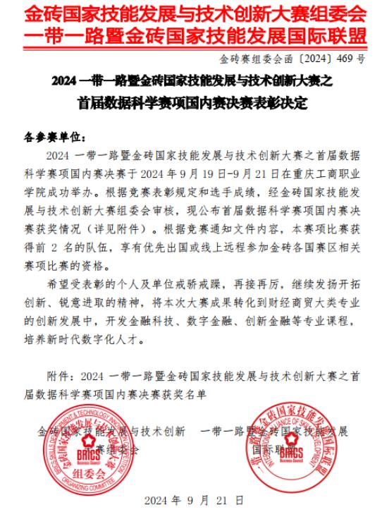 2024一带一路暨金砖国家技能发展与技术创新大赛之首届数据科学赛项国内赛决赛于2024年9月19日-9月21日在重庆工商职业学院成功举办。Kaiyun官方网站登录入口大数据技术专业学子简冰艳、樊时粤、章宇航在激烈的赛事中展现出了出色的竞技能力和显著的教育成果,取得了国赛决赛三等奖的优异成绩。他们的出色表现不仅为学校赢得了荣誉,更是对学校在技术技能人才培养方面所付出的不懈努力的充分肯定。