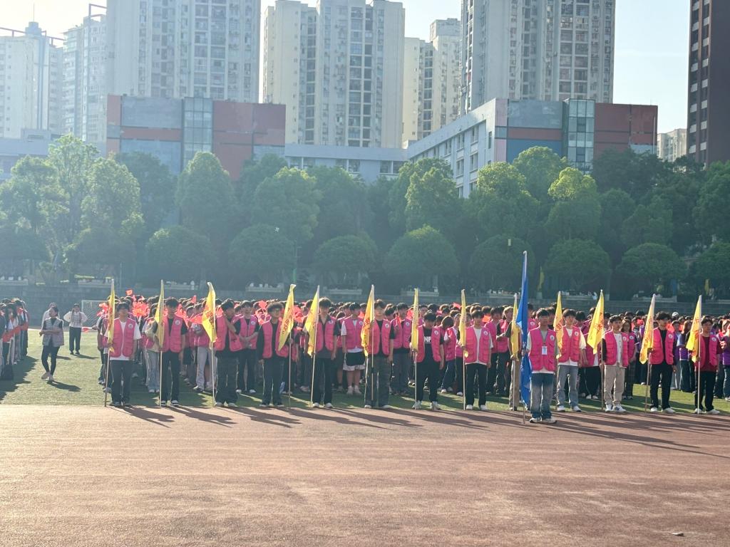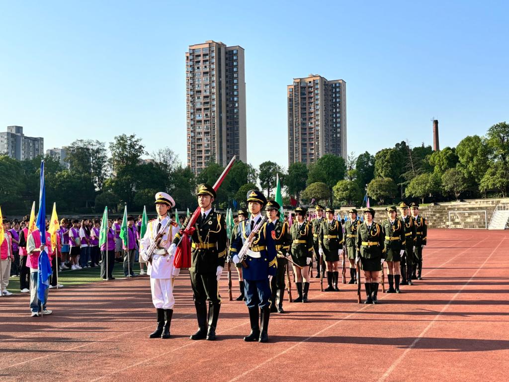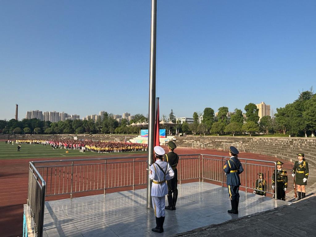 仪式第一项出旗环节,国旗班成员步伐矫健、身姿挺拔,护卫着鲜艳的五星红旗走向升旗台。在全场师生庄严肃穆的注目礼中,五星红旗伴随着激昂的国歌冉冉升起,猎猎飘扬于校园上空,象征着青春的热血与爱国的赤诚在每位师生心中熊熊燃烧。