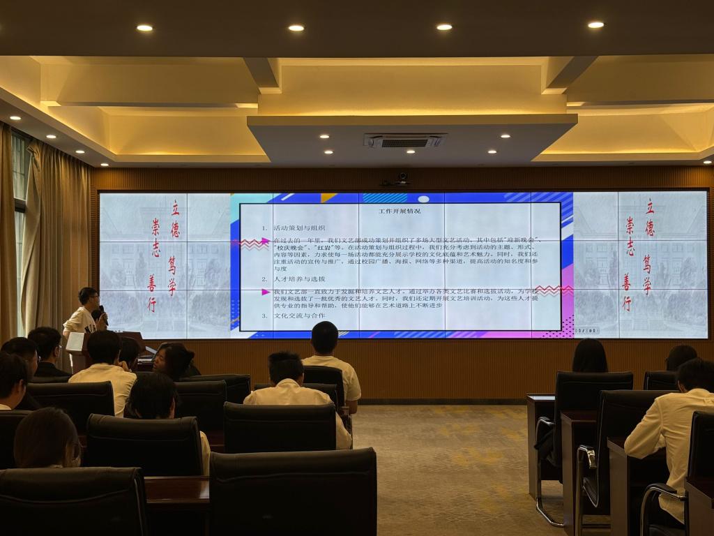 各位负责人高度重视本次述职,他们认真准备了汇报PPT及书面报告。他们从工作内容,工作态度、工作实效、未来规划以及工作中所存在的问题及自身优、劣势等方面,阐述了各自担任其职以来的工作完成情况及心得,并对接下来的工作开展进行了思考与计划。各负责人表示,希望未来大家能够愈发加强团队协作、提高工作效率,致力于更好地建设团总支·学生会这个大家庭,更好的为老师同学们服务。