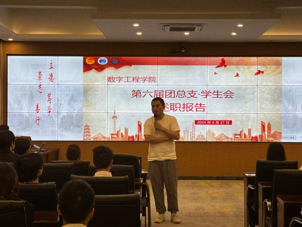 2024年6月27日1110分,数字工程学院团总支·学生会在大数据中心举行学生会述职大会。这次大会旨在对2024年上学期的工作总结。参会的人员有团总支书记樊得旺、第六届学生会主要负责人和各部门工作人员